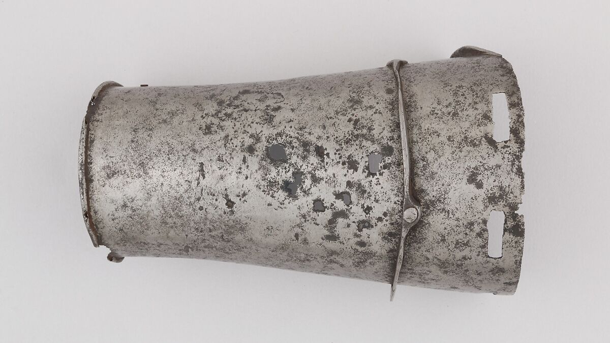 This is part of a large find of medieval armor discovered in 1840 in the ruins of the fortress of Chalcis, on the Greek island of Euboea (then a Venetian colony called Negroponte). The fortress had been captured and destroyed by the Turks in 1470. Now divided largely between the Ethnological Museum, Athens, and The Metropolitan Museum of Art, the Chalcis hoard contains many rare and unusual elements of fourteenth- and fifteenth-century armor. Of particular importance are the variety of headpieces and the many fragments of brigandines (armor for the torso constructed of small plates riveted to layers of fabric), some of which retain portions of their original velvet covering. The Chalcis armor provides a unique picture of the armament used in the Aegean, one of the easternmost military outposts of the Venetian empire.