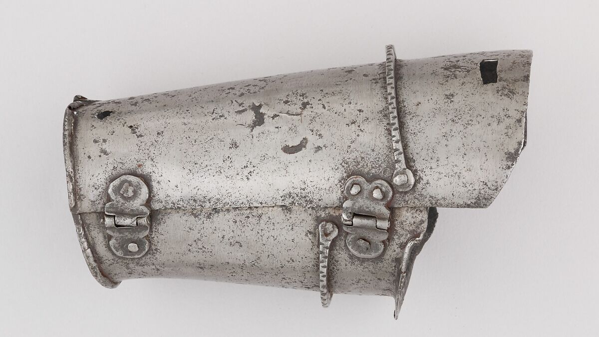 This is part of a large find of medieval armor discovered in 1840 in the ruins of the fortress of Chalcis, on the Greek island of Euboea (then a Venetian colony called Negroponte). The fortress had been captured and destroyed by the Turks in 1470. Now divided largely between the Ethnological Museum, Athens, and The Metropolitan Museum of Art, the Chalcis hoard contains many rare and unusual elements of fourteenth- and fifteenth-century armor. Of particular importance are the variety of headpieces and the many fragments of brigandines (armor for the torso constructed of small plates riveted to layers of fabric), some of which retain portions of their original velvet covering. The Chalcis armor provides a unique picture of the armament used in the Aegean, one of the easternmost military outposts of the Venetian empire.