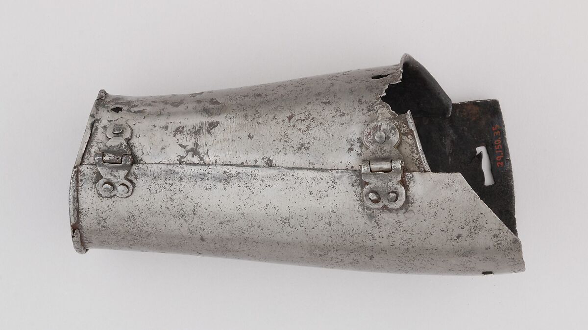 This is part of a large find of medieval armor discovered in 1840 in the ruins of the fortress of Chalcis, on the Greek island of Euboea (then a Venetian colony called Negroponte). The fortress had been captured and destroyed by the Turks in 1470. Now divided largely between the Ethnological Museum, Athens, and The Metropolitan Museum of Art, the Chalcis hoard contains many rare and unusual elements of fourteenth- and fifteenth-century armor. Of particular importance are the variety of headpieces and the many fragments of brigandines (armor for the torso constructed of small plates riveted to layers of fabric), some of which retain portions of their original velvet covering. The Chalcis armor provides a unique picture of the armament used in the Aegean, one of the easternmost military outposts of the Venetian empire.