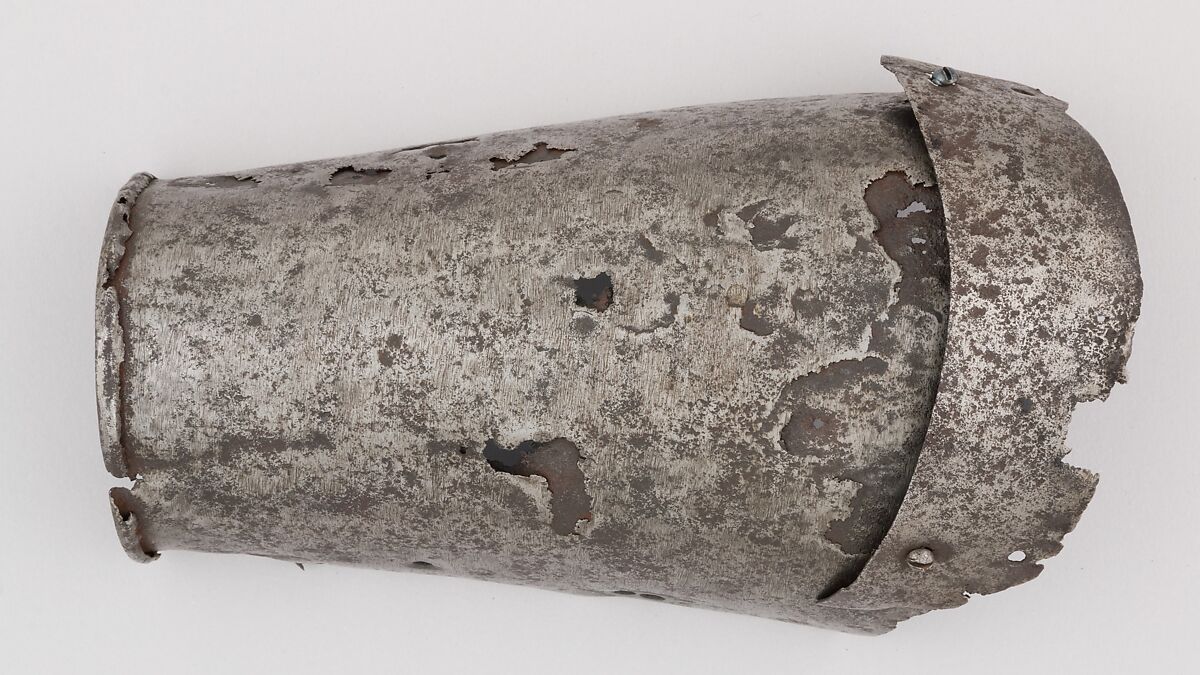 This is part of a large find of medieval armor discovered in 1840 in the ruins of the fortress of Chalcis, on the Greek island of Euboea (then a Venetian colony called Negroponte). The fortress had been captured and destroyed by the Turks in 1470. Now divided largely between the Ethnological Museum, Athens, and The Metropolitan Museum of Art, the Chalcis hoard contains many rare and unusual elements of fourteenth- and fifteenth-century armor. Of particular importance are the variety of headpieces and the many fragments of brigandines (armor for the torso constructed of small plates riveted to layers of fabric), some of which retain portions of their original velvet covering. The Chalcis armor provides a unique picture of the armament used in the Aegean, one of the easternmost military outposts of the Venetian empire.