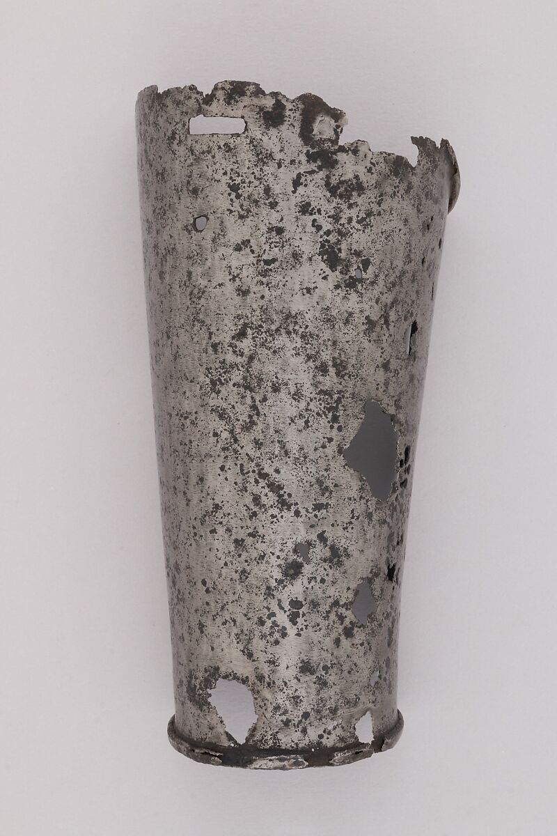 This is part of a large find of medieval armor discovered in 1840 in the ruins of the fortress of Chalcis, on the Greek island of Euboea (then a Venetian colony called Negroponte). The fortress had been captured and destroyed by the Turks in 1470. Now divided largely between the Ethnological Museum, Athens, and The Metropolitan Museum of Art, the Chalcis hoard contains many rare and unusual elements of fourteenth- and fifteenth-century armor. Of particular importance are the variety of headpieces and the many fragments of brigandines (armor for the torso constructed of small plates riveted to layers of fabric), some of which retain portions of their original velvet covering. The Chalcis armor provides a unique picture of the armament used in the Aegean, one of the easternmost military outposts of the Venetian empire.