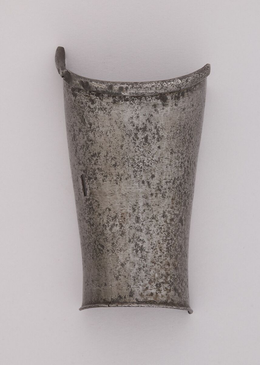 This is part of a large find of medieval armor discovered in 1840 in the ruins of the fortress of Chalcis, on the Greek island of Euboea (then a Venetian colony called Negroponte). The fortress had been captured and destroyed by the Turks in 1470. Now divided largely between the Ethnological Museum, Athens, and The Metropolitan Museum of Art, the Chalcis hoard contains many rare and unusual elements of fourteenth- and fifteenth-century armor. Of particular importance are the variety of headpieces and the many fragments of brigandines (armor for the torso constructed of small plates riveted to layers of fabric), some of which retain portions of their original velvet covering. The Chalcis armor provides a unique picture of the armament used in the Aegean, one of the easternmost military outposts of the Venetian empire.