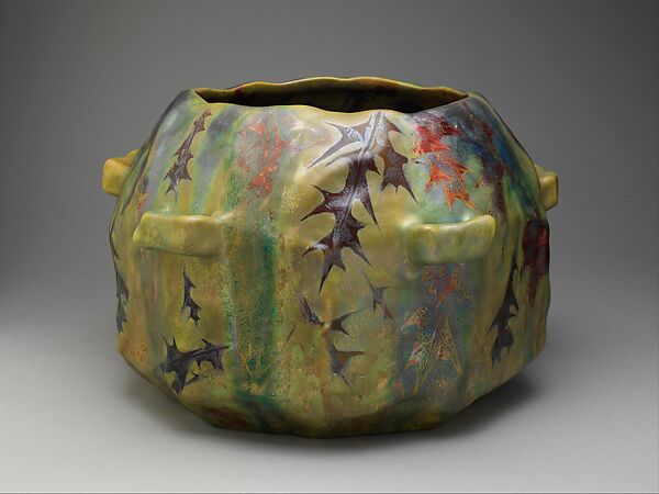 The highly organic quality of the jardinière derives from both its irregular shape, which resembles a large gourd, and from its richly patterned luster glaze. The primary decoration consists of scattered copper-red oak leaves silhouetted against a mottled green and beige ground, and the range of iridescent colors achieved by Lévy-Dhurmer creates a sense of depth not found in more conventional glazes. The naturalism of both the form and the decoration and the originality of the conception mark this jardinière as a superb example of Art Nouveau ceramics.