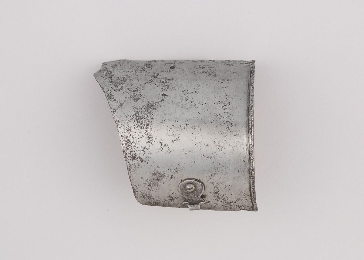 This is part of a large find of medieval armor discovered in 1840 in the ruins of the fortress of Chalcis, on the Greek island of Euboea (then a Venetian colony called Negroponte). The fortress had been captured and destroyed by the Turks in 1470. Now divided largely between the Ethnological Museum, Athens, and The Metropolitan Museum of Art, the Chalcis hoard contains many rare and unusual elements of fourteenth- and fifteenth-century armor. Of particular importance are the variety of headpieces and the many fragments of brigandines (armor for the torso constructed of small plates riveted to layers of fabric), some of which retain portions of their original velvet covering. The Chalcis armor provides a unique picture of the armament used in the Aegean, one of the easternmost military outposts of the Venetian empire.