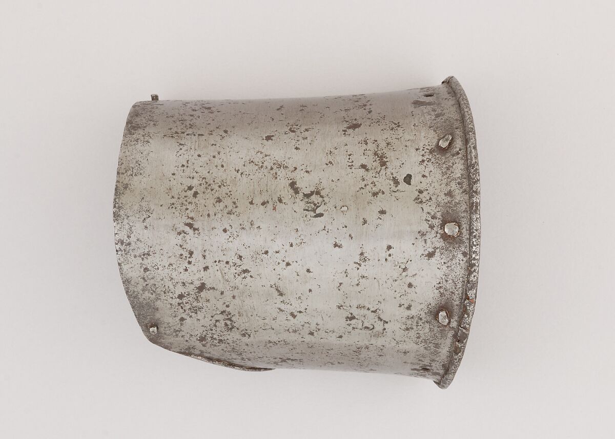 This is part of a large find of medieval armor discovered in 1840 in the ruins of the fortress of Chalcis, on the Greek island of Euboea (then a Venetian colony called Negroponte). The fortress had been captured and destroyed by the Turks in 1470. Now divided largely between the Ethnological Museum, Athens, and The Metropolitan Museum of Art, the Chalcis hoard contains many rare and unusual elements of fourteenth- and fifteenth-century armor. Of particular importance are the variety of headpieces and the many fragments of brigandines (armor for the torso constructed of small plates riveted to layers of fabric), some of which retain portions of their original velvet covering. The Chalcis armor provides a unique picture of the armament used in the Aegean, one of the easternmost military outposts of the Venetian empire.