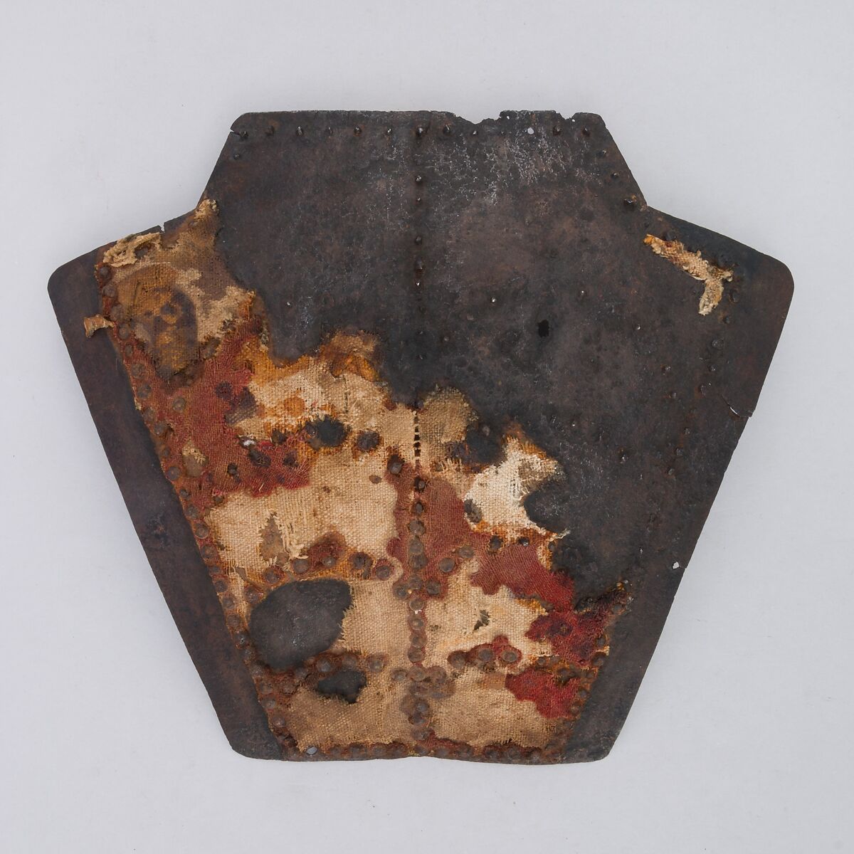 This plate would have protected the area at the top of the wearer's back at the base of the neck and between the shoulder blades. It retains large sections of its original textile covering.