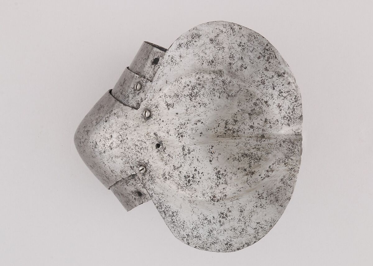 This is part of a large find of medieval armor discovered in 1840 in the ruins of the fortress of Chalcis, on the Greek island of Euboea (then a Venetian colony called Negroponte). The fortress had been captured and destroyed by the Turks in 1470. Now divided largely between the Ethnological Museum, Athens, and The Metropolitan Museum of Art, the Chalcis hoard contains many rare and unusual elements of fourteenth- and fifteenth-century armor. Of particular importance are the variety of headpieces and the many fragments of brigandines (armor for the torso constructed of small plates riveted to layers of fabric), some of which retain portions of their original velvet covering. The Chalcis armor provides a unique picture of the armament used in the Aegean, one of the easternmost military outposts of the Venetian empire.