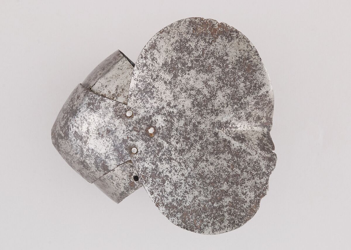This is part of a large find of medieval armor discovered in 1840 in the ruins of the fortress of Chalcis, on the Greek island of Euboea (then a Venetian colony called Negroponte). The fortress had been captured and destroyed by the Turks in 1470. Now divided largely between the Ethnological Museum, Athens, and The Metropolitan Museum of Art, the Chalcis hoard contains many rare and unusual elements of fourteenth- and fifteenth-century armor. Of particular importance are the variety of headpieces and the many fragments of brigandines (armor for the torso constructed of small plates riveted to layers of fabric), some of which retain portions of their original velvet covering. The Chalcis armor provides a unique picture of the armament used in the Aegean, one of the easternmost military outposts of the Venetian empire.
