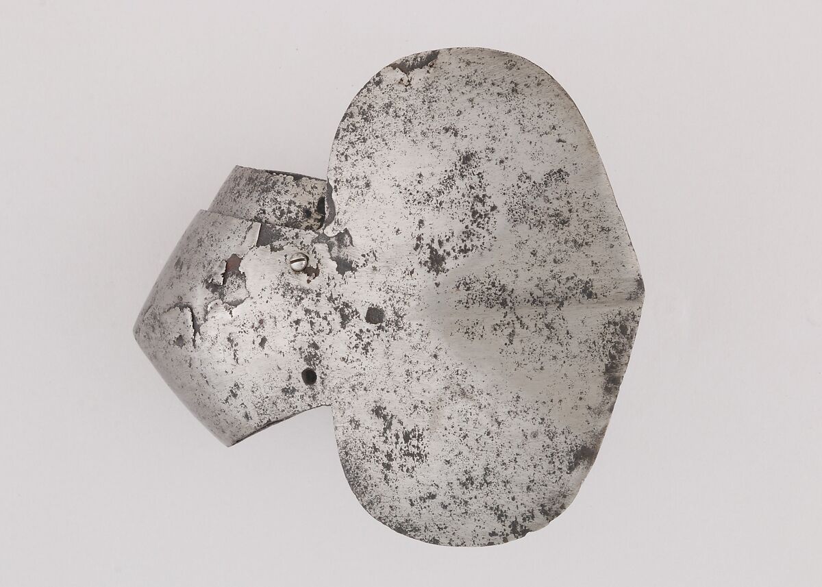 This is part of a large find of medieval armor discovered in 1840 in the ruins of the fortress of Chalcis, on the Greek island of Euboea (then a Venetian colony called Negroponte). The fortress had been captured and destroyed by the Turks in 1470. Now divided largely between the Ethnological Museum, Athens, and The Metropolitan Museum of Art, the Chalcis hoard contains many rare and unusual elements of fourteenth- and fifteenth-century armor. Of particular importance are the variety of headpieces and the many fragments of brigandines (armor for the torso constructed of small plates riveted to layers of fabric), some of which retain portions of their original velvet covering. The Chalcis armor provides a unique picture of the armament used in the Aegean, one of the easternmost military outposts of the Venetian empire.