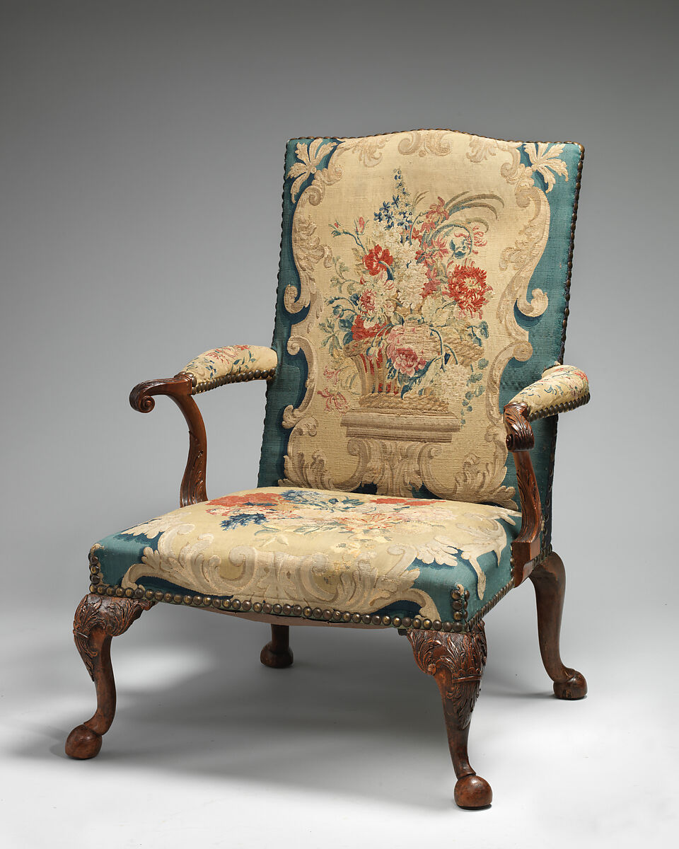 The tapestry panels displaying bouquets, baskets, and vases of flowers were probably designed by the painter Tobias Stranover (1684–1756), who specialized in the depiction of birds, flowers, and still life, and were woven by William Bradshaw (act. 1728–75) in London.