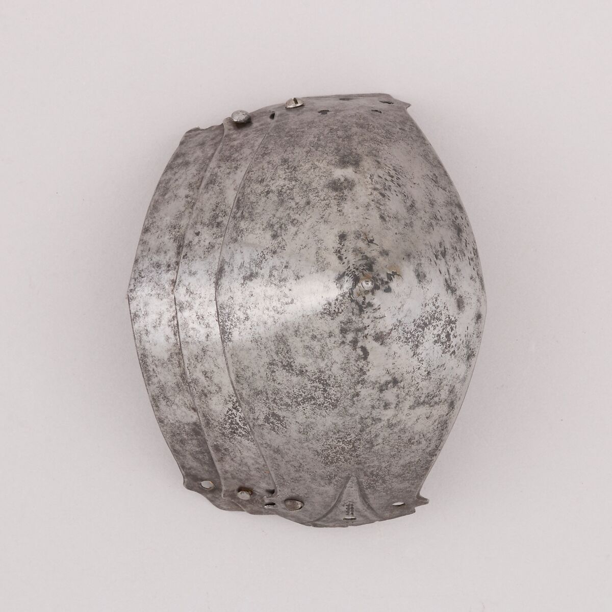 This is part of a large find of medieval armor discovered in 1840 in the ruins of the fortress of Chalcis, on the Greek island of Euboea (then a Venetian colony called Negroponte). The fortress had been captured and destroyed by the Turks in 1470. Now divided largely between the Ethnological Museum, Athens, and The Metropolitan Museum of Art, the Chalcis hoard contains many rare and unusual elements of fourteenth- and fifteenth-century armor. Of particular importance are the variety of headpieces and the many fragments of brigandines (armor for the torso constructed of small plates riveted to layers of fabric), some of which retain portions of their original velvet covering. The Chalcis armor provides a unique picture of the armament used in the Aegean, one of the easternmost military outposts of the Venetian empire.