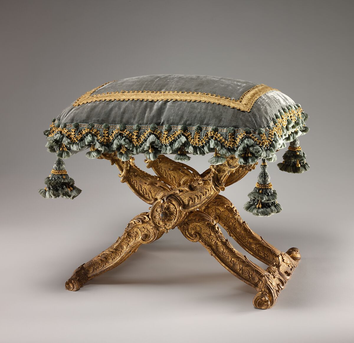 Consisting of calcium carbonate mixed with rabbit glue, gesso or whiting forms the base coat for the gilding. After it has been applied to a carved frame and has dried, this layer needs to be recut to restore detail or definition to the decoration. Motifs or ground patterns too delicate to be cut into the wood itself, such as the diaper design on the Museum’s stools, were also added during the reparure. Despite the fact that the appearance of these low seats depended largely on the richness of the upholstery and trimmings of their cushions, the frames of the stools were elaborately carved with Rococo ornament. The shaped outline of the supports is enlivened with bulrushes, basketweave motifs, and partly openworked acanthus leaves. Large rosettes cover the bolts that allow the stools to fold.