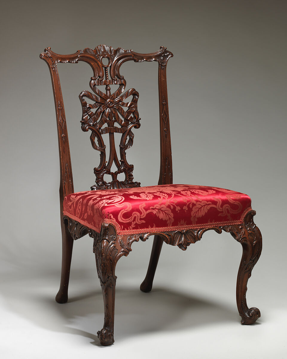 The design is based on one of several "ribband-back chairs" in the first edition of Thomas Chippendale's influential book, The Gentleman and Cabinet-Maker's Director of 1754. The preparatory drawing for this plate, which also appeared in the editions of 1755 and 1762, is in the Drawings Department at The Metropolitan Museum of Art.