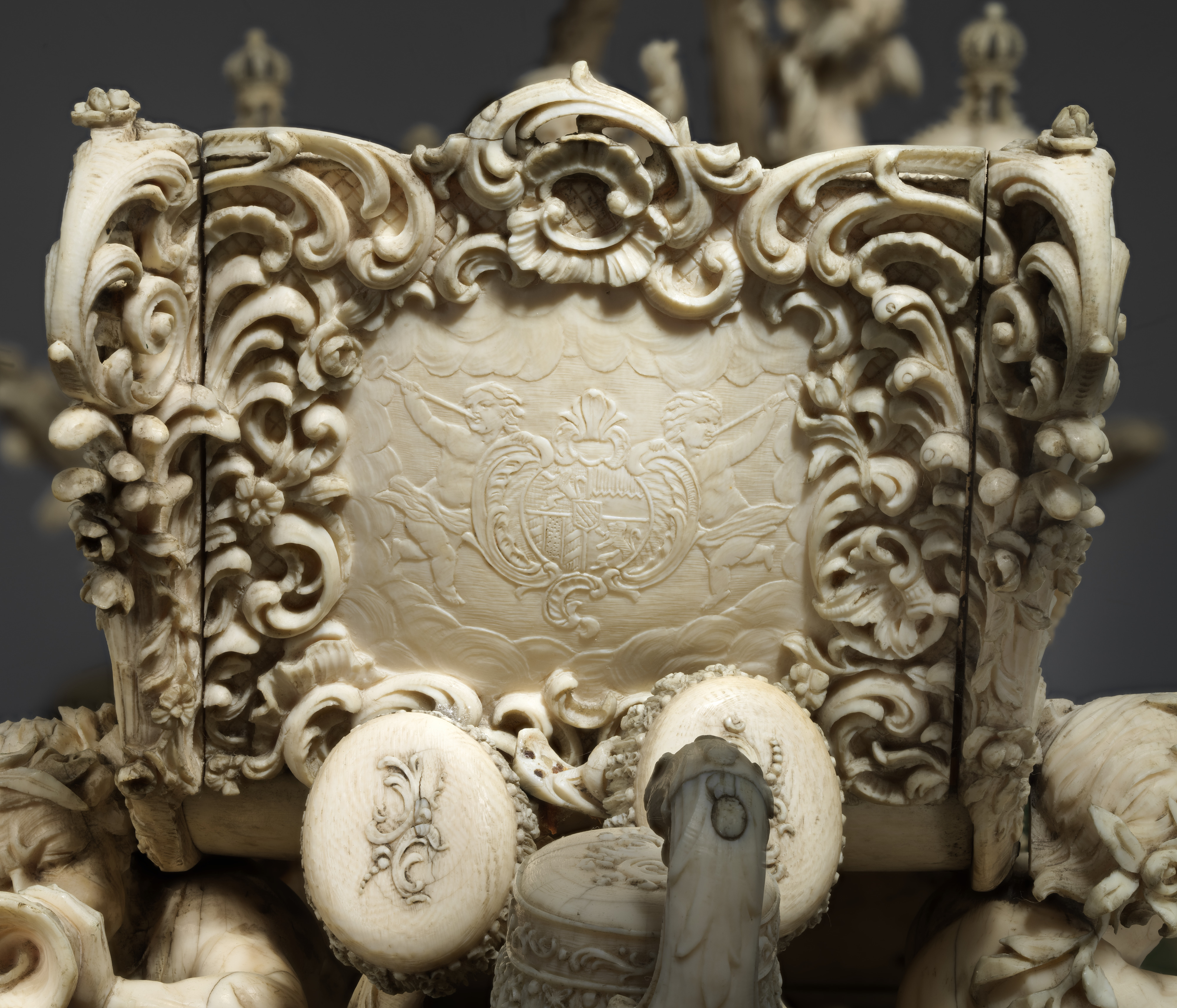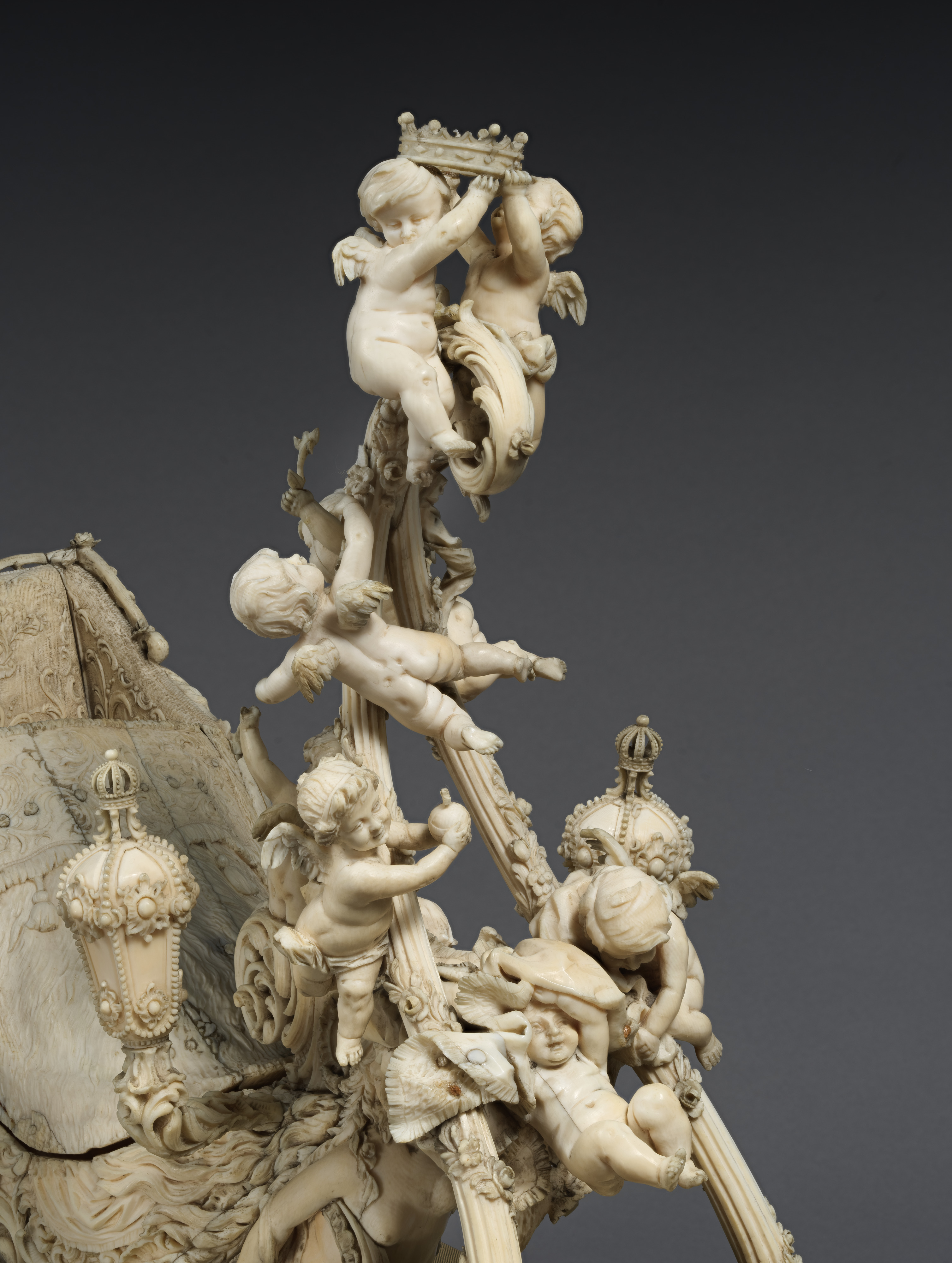 This delicately carved miniaturized yet monumental object is a stylized version of King Ludwig II of Bavaria’s (1845–1886) famous gilt-wood sleigh designed by Franz Seitz. The full-size sleigh had a strong battery-powered light in the crown on top and was widely considered the first electrically illuminated vehicle in Bavaria. Ludwig, the “Dream” or “Mad” king, who slept during the day and was active at night, astonished the local population with his “miraculous glooming” vehicle. This fantastic model, drawn by swans rather than horses, alludes to the first act of Richard Wagner’s opera Lohengrin. The crowns around the swans’ necks and the imposing size suggest that it may have been a display piece at the castle of Neuschwanstein or Linderhof Palace, two of the king’s architectural fairytale creations that incorporate crowned swans as royal emblems.