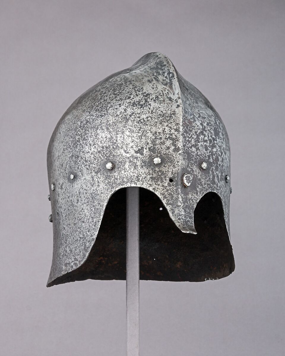 This is part of a large find of medieval armor discovered in 1840 in the ruins of the fortress of Chalcis, on the Greek island of Euboea (then a Venetian colony called Negroponte). The fortress had been captured and destroyed by the Turks in 1470. Now divided largely between the Ethnological Museum, Athens, and The Metropolitan Museum of Art, the Chalcis hoard contains many rare and unusual elements of fourteenth- and fifteenth-century armor. Of particular importance are the variety of headpieces and the many fragments of brigandines (armor for the torso constructed of small plates riveted to layers of fabric), some of which retain portions of their original velvet covering. The Chalcis armor provides a unique picture of the armament used in the Aegean, one of the easternmost military outposts of the Venetian empire.