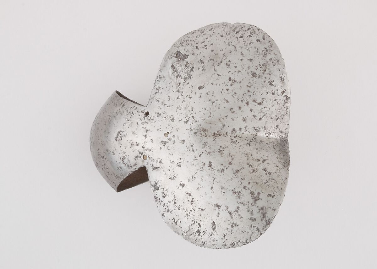 This is part of a large find of medieval armor discovered in 1840 in the ruins of the fortress of Chalcis, on the Greek island of Euboea (then a Venetian colony called Negroponte). The fortress had been captured and destroyed by the Turks in 1470. Now divided largely between the Ethnological Museum, Athens, and The Metropolitan Museum of Art, the Chalcis hoard contains many rare and unusual elements of fourteenth- and fifteenth-century armor. Of particular importance are the variety of headpieces and the many fragments of brigandines (armor for the torso constructed of small plates riveted to layers of fabric), some of which retain portions of their original velvet covering. The Chalcis armor provides a unique picture of the armament used in the Aegean, one of the easternmost military outposts of the Venetian empire.