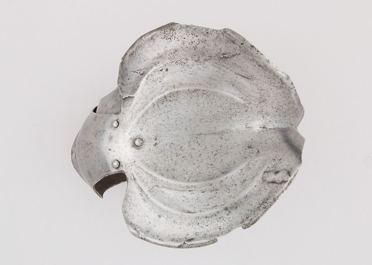 This is part of a large find of medieval armor discovered in 1840 in the ruins of the fortress of Chalcis, on the Greek island of Euboea (then a Venetian colony called Negroponte). The fortress had been captured and destroyed by the Turks in 1470. Now divided largely between the Ethnological Museum, Athens, and The Metropolitan Museum of Art, the Chalcis hoard contains many rare and unusual elements of fourteenth- and fifteenth-century armor. Of particular importance are the variety of headpieces and the many fragments of brigandines (armor for the torso constructed of small plates riveted to layers of fabric), some of which retain portions of their original velvet covering. The Chalcis armor provides a unique picture of the armament used in the Aegean, one of the easternmost military outposts of the Venetian empire.