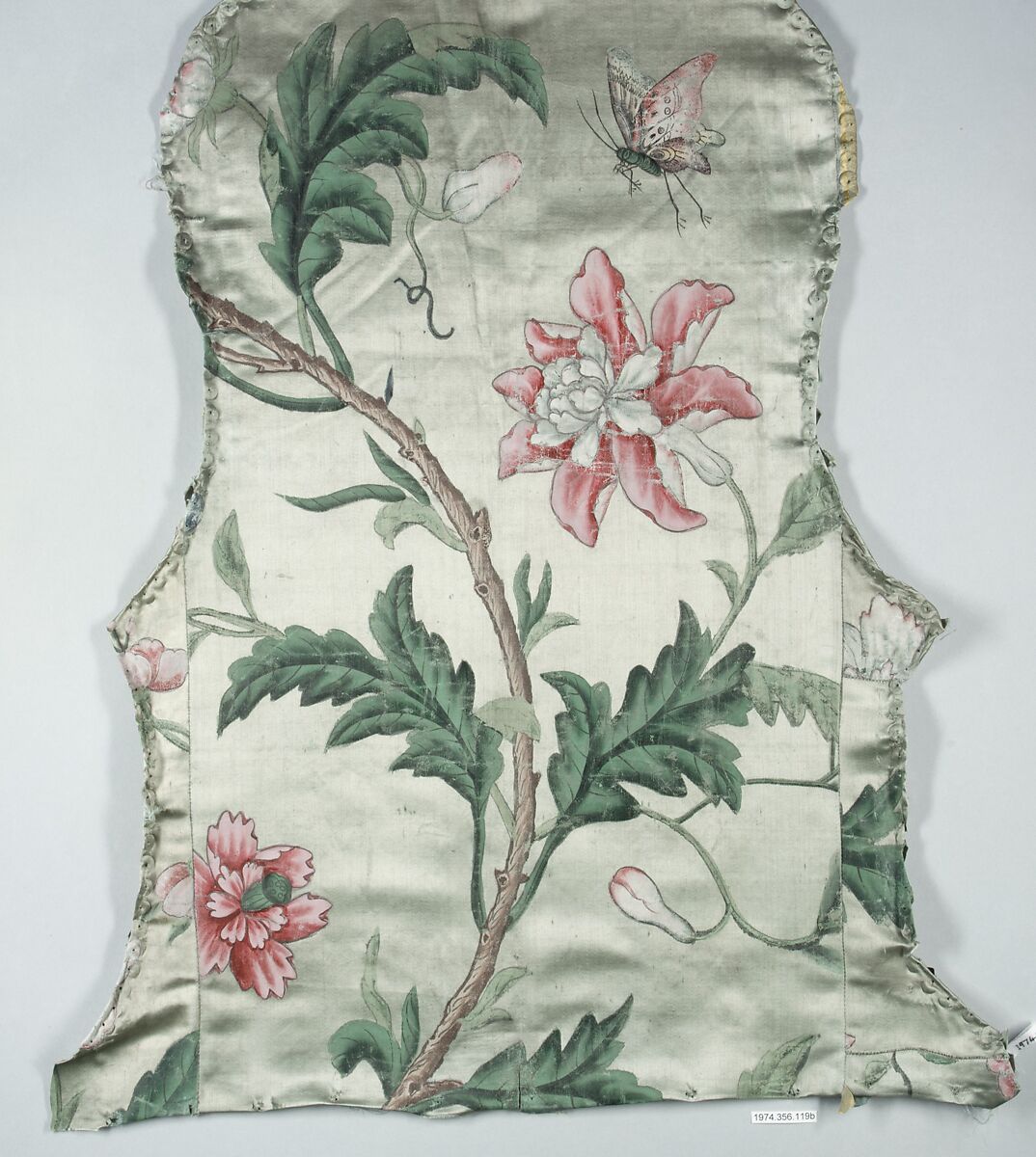 These upholstery panels were made for a chair that was part of a set (see 1974.356.114–.121) made for the Franckenstein Pavilion in the gardens of Seehof Castle near Bamberg, one of the three summer residences in Southern Germany used by Adam Friedrich von Seinsheim, prince bishop of Würzberg and Bamberg. A true garden enthusiast, it was under von Seinsheim that the gardens of Seehof were embellished, which must have resembled the still extant Rococo gardens completed by von Seinsheim at Veitshöchheim. His love for gardens and garden imagery also carried over into the interior decoration and furnishings of his castles, as the Seehof furniture demonstrates. A unique example of German Rococo furniture executed in a more flamboyant style than its French prototypes, the ensemble was designed specifically for the Garden Room in the Franckenstein Pavilion. Used as an audience room, it was referred to as the "Green Trellis Chamber" in the 1774 Seehof inventory and painted entirely with trompe l'oeil trellis and foliage. The garden room's furniture was made to match: the backs of the chairs and settees are richly carved in the form of garden trellis-work with colored flowers and foliage.