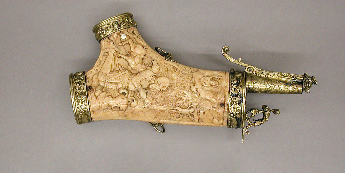The horn is carved with a figure of Saint Hubert, patron of hunters.