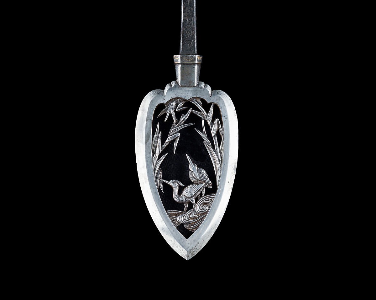 Large arrowheads, pierced and elaborately chiseled with landscapes, birds, flowers, dragons, and Buddhist divinities, were created to be admired for the beauty of their metalwork and design rather than for use in archery. This arrowhead is dated 1645 and signed by Umetada Motoshige (died 1675), a member of the Umetada school of swordsmiths, tsuba makers, and iron chiselers. It belongs to a group of more than thirty similarly signed and dated pieces in the Metropolitan Museum's collection (including acc. nos. 32.75.318, .321, .327, .330, .334, .339–.340, .398–.399, .403, .406, .409) that may have been made for presentation or as a votive offering to a shrine.