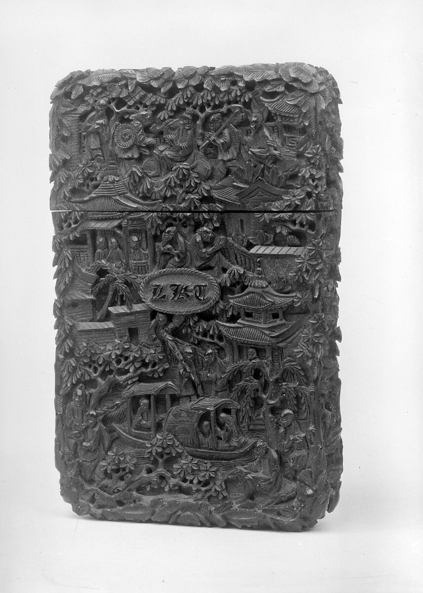 The vogue for women's calling cards reached its peak in the mid-nineteenth century, when women of social standing exchanged cards with one another or left them in the homes of their hosts as tokens of their visits. Makers of the cases that held such cards are known to have existed not only America and Europe, but also in China and India, where they formed part of the export trade. This case was owned by Lucy Keating Tuckerman, whose monogram it bears. Tuckerman was a relative of Lucius Tuckerman, one of the founders of The Metropolitan Museum of Art. The case was probably given to her by her husband, who made several voyages to China on the merchant ship "Cowper" during the 1830s.