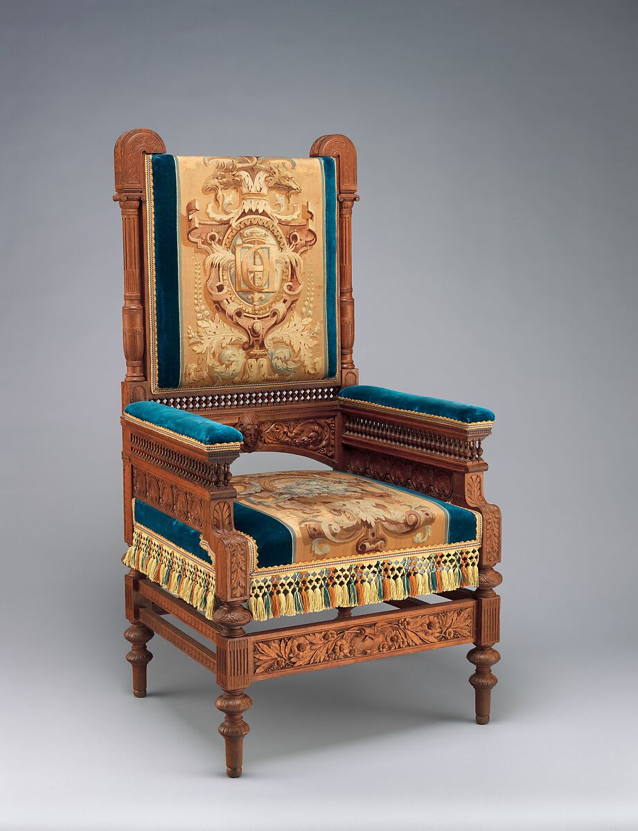 This armchair, along with a matching side chair and cabinet, was made for Pottier and Stymus’ display at the 1876 Centennial International Exhibition in Philadelphia. This seminal event offered unprecedented exposure to potential patrons and sparked the nation’s preference for the Aesthetic style. Founding partner Auguste Pottier then donated the pieces to the Metropolitan Museum as examples of distinguished contemporary craftsmanship.