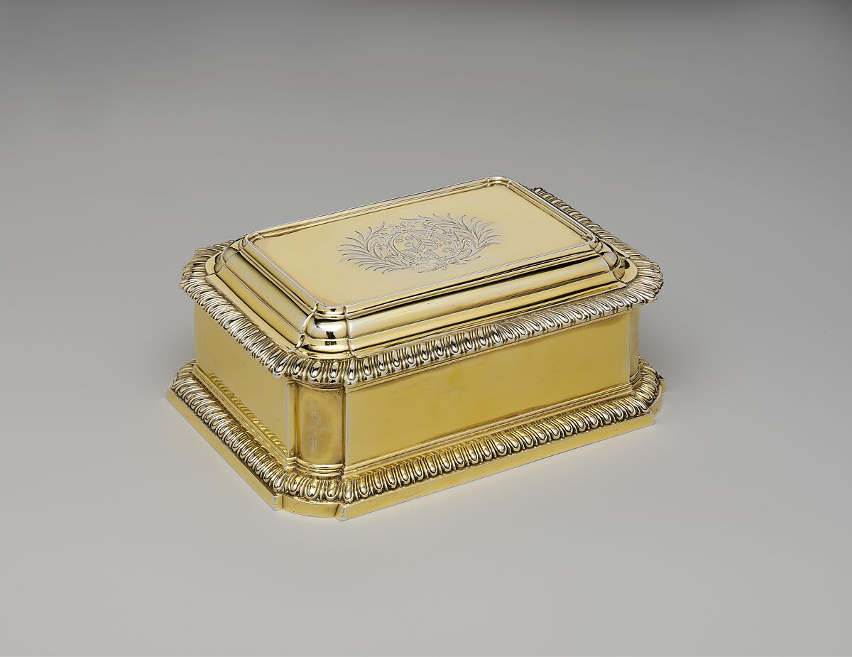 These boxes were part of a toilet service sold by the leading London retailers Parker and Wakelin to John Heathcote, who, a few years earlier, had married the heiress Lydia Moyer. Parker and Wakelin’s accounts for the sale show that the service included eight such boxes, a pair of candlesticks, two "essence pots," a looking glass, a "jewells trunk," and a pair of octagonal pierced trays. The cost for gilding the service was more than £56—roughly equal to the annual wage of a successful artisan—and the entire bill came to more than £300. There was a further charge of £6 6s for a "red morocco leather case with a drawer & 2 cushions."