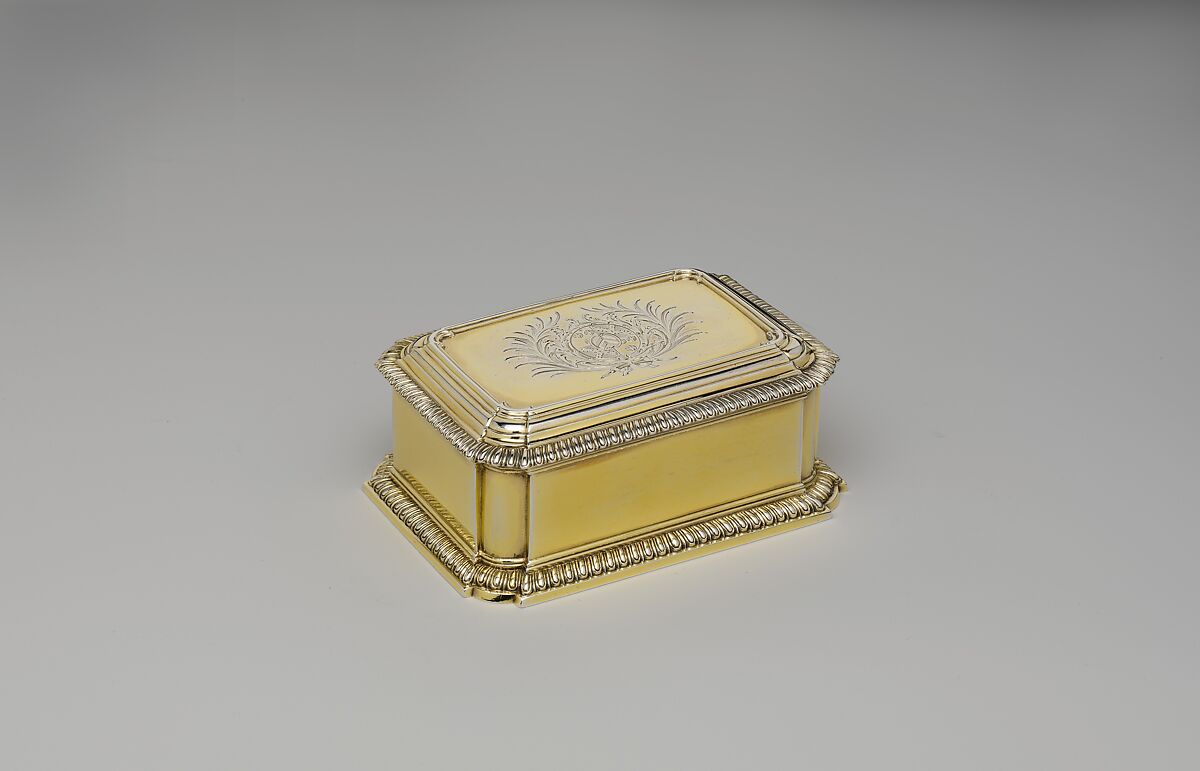 These boxes were part of a toilet service sold by the leading London retailers Parker and Wakelin to John Heathcote, who, a few years earlier, had married the heiress Lydia Moyer. Parker and Wakelin’s accounts for the sale show that the service included eight such boxes, a pair of candlesticks, two "essence pots," a looking glass, a "jewells trunk," and a pair of octagonal pierced trays. The cost for gilding the service was more than £56—roughly equal to the annual wage of a successful artisan—and the entire bill came to more than £300. There was a further charge of £6 6s for a "red morocco leather case with a drawer & 2 cushions."