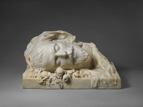 The great tragic actress, Sarah Bernhardt, was also a gifted sculptor. She carved this haunting memorial to her husband, the actor Jacques Damala (1855–1889), shortly after he had died of a drug overdose. Bernhardt envisions Damala as if on his deathbed, his youthful features captured in sleep. Yet the sheet covering him also is a winding shroud and the cut flowers wilt upon a marble slab that is reminiscent of a tomb.