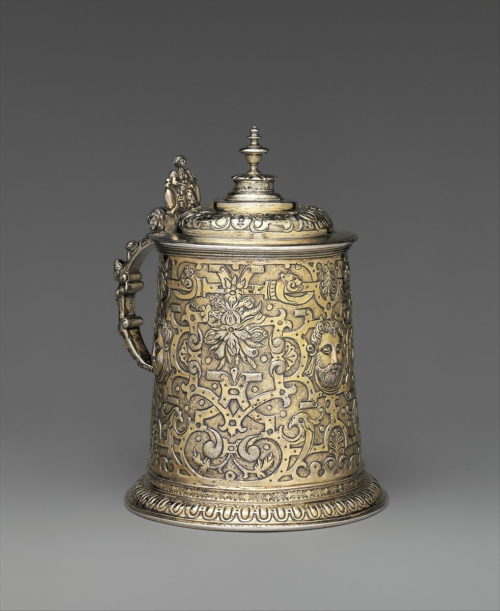 The tapering cylindrical body of this tankard is embossed with female and male masks and a very dense pattern of strap- and scrollwork and festoons. Only the gadrooned foot rim, undecorated frame of the lid, and plain finial offer a moment of classical restraint.