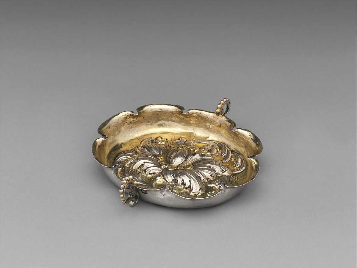 This type of small flat oval bowl with six or eight concave lobes and handles was very popular throughout Central and Southeastern Europe during the seventeenth century. The form derives from models produced in the German-speaking area. The dramatically swirling foliage around the single flower in high relief, together with the sensitively applied partial gilding, testify to the refinement of Hungarian goldsmithing.