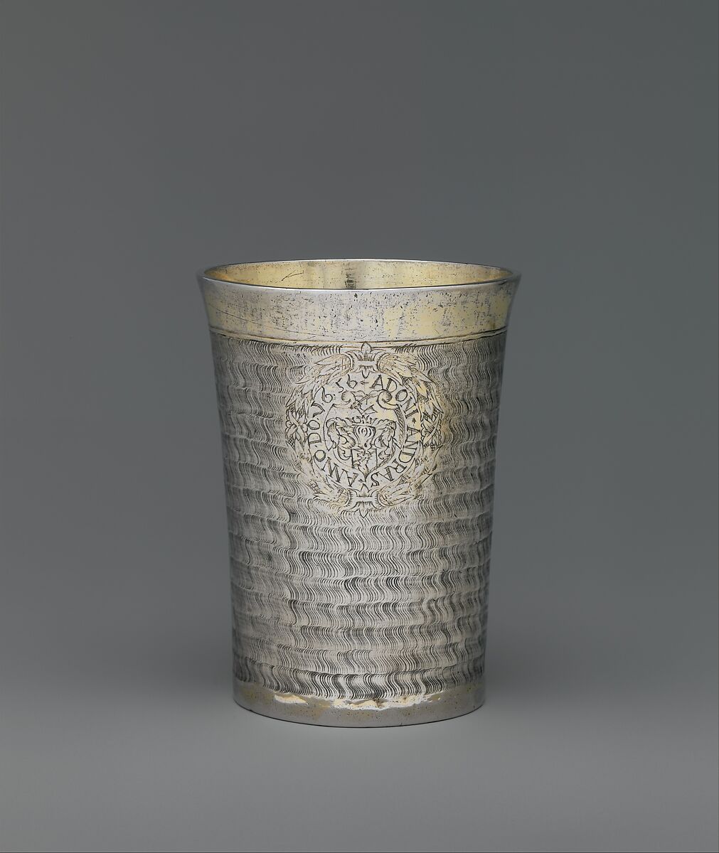 A wave pattern, suggestive of rippling water in a slight breeze or a lamb’s fleecy coat, covers the body of this beaker. This type of decoration is unique to sixteenth- and seventeenth-century Hungarian and Transylvanian silver. It is a variation of the snakeskin pattern: both are designed to provide better grip. A closely-related beaker formerly in the collection of Yves Saint Laurent is numbered, as are other examples, which indicates it was part of a larger set. The present example was once in the Andrássy collection.