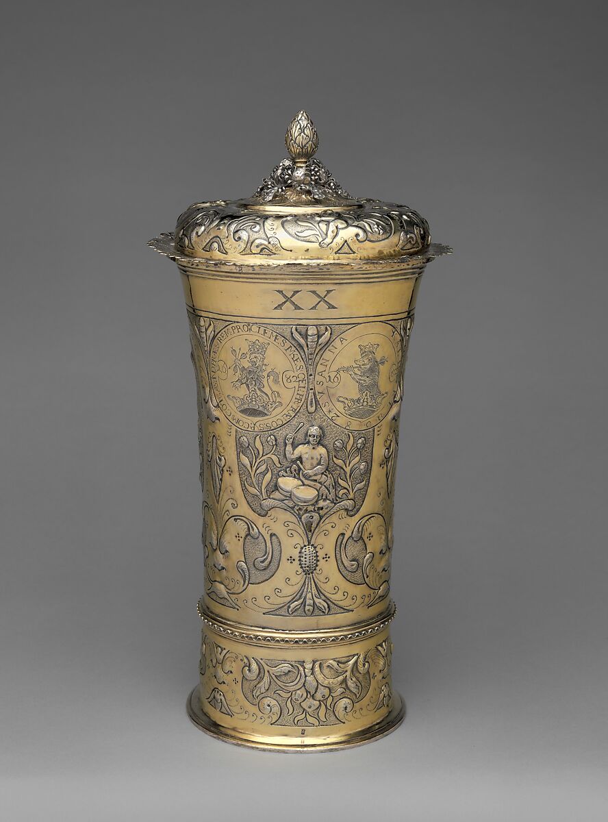 This monumental beaker is the one of the largest known of its type. It has a hollow base and an undulating ring that marks the actual bottom of the vessel on the outside. Both of these features are characteristic of Hungarian and Transylvanian production. The inscribed coat of arms at left indicates that it belonged to a member of a princely Transylvanian family, Count Mikes, who came from one of the most ancient dynasties of the Székely people. Together with the Saxons, the Székely were crucial for the defense of Hungary’s eastern border against the Ottomans. The number “XX” may indicate that the beaker was the largest in an assembled set from which two smaller beakers are now preserved in the Hungarian National Museum in Budapest. The lute-playing angel garbed in peasant costume is very close to a similar figure decorating a silver-gilt tankard by Michael Schellung, made in Brassó about 1640. Both were likely inspired by the same printed design source.