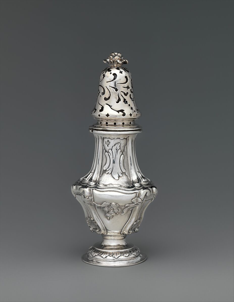 Sugar was a rare commodity in the eighteenth century and often surrounded by ceremony. The sugar caster, acc. no. 2010.110.59a, b, with its pierced domed lid, forms a matching pair with the mustard pot, 2010.110.60, with its hinged lid and a slot for a ladle. Sets like this one were very rare on the European continent, which may indicate that the goldsmith or patron was familiar with English silver, where these types were more common. Italian and Austrian Baroque architecture clearly inspired the powerful, bulging outline of this vessel. The engraved arms refer to the family of the Princes of Reuss (Younger Line).