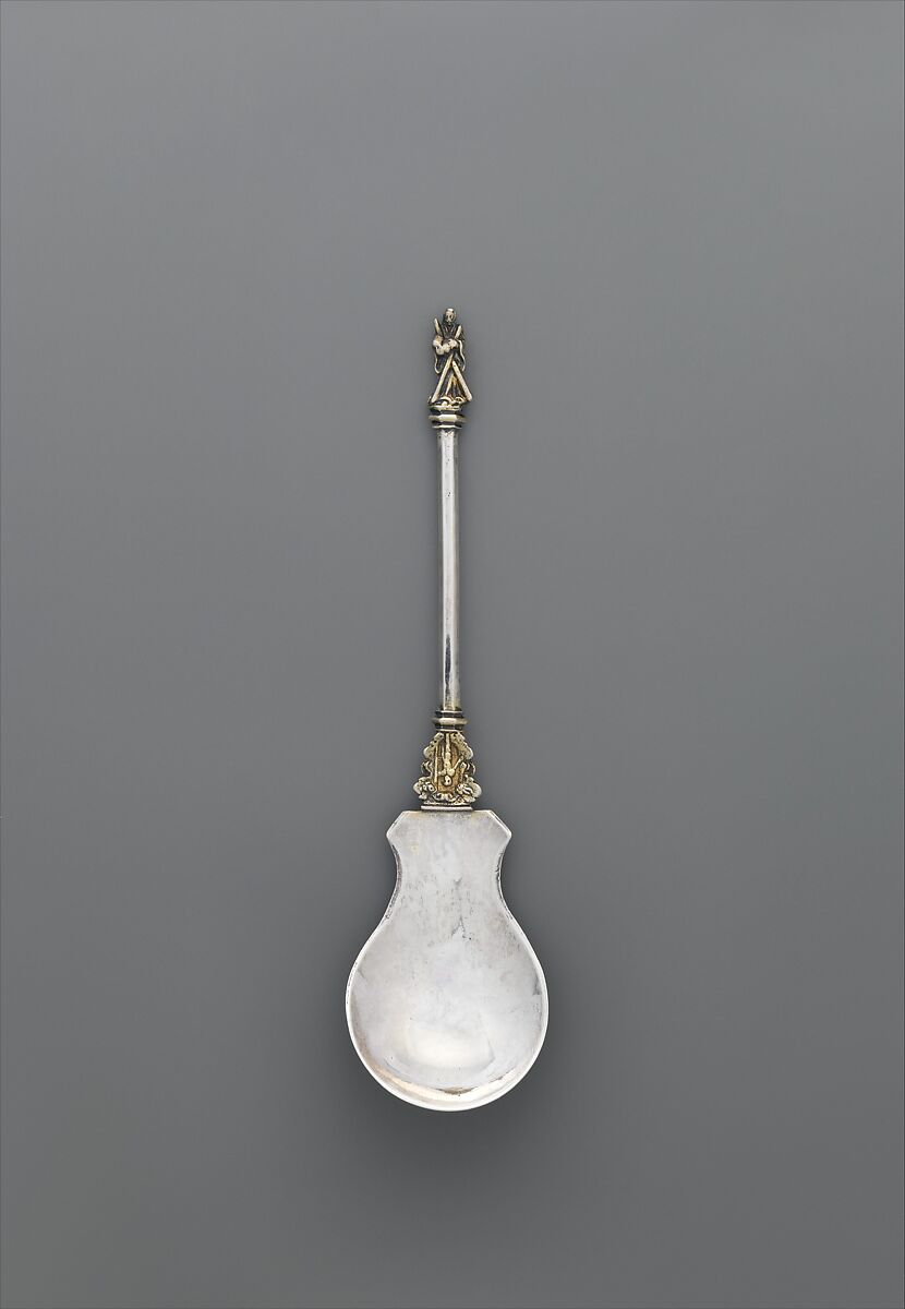 The cast finial of this spoon depicts Saint Andrew, recognizable by his attribute, a cross in the shape of an X. This motif suggests that the spoon was part of a set of thirteen with representations of the twelve apostles and either Christ or the Madonna and Child. Beginning in the fifteenth century, such sets became popular as ostentatious christening gifts.