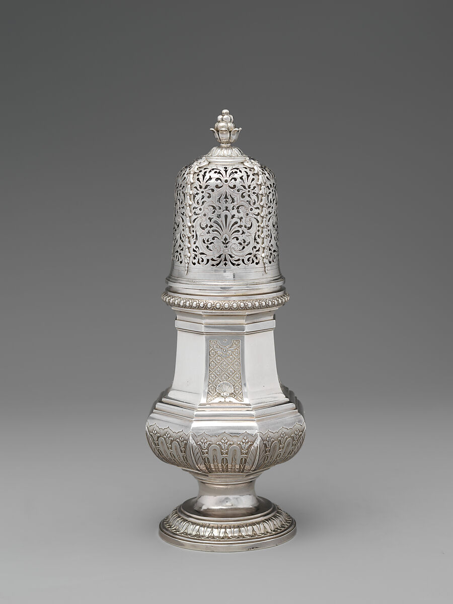 The early cylindrical form of the sugar caster with a pierced domed lid surmounted by a finial or knob, gave way in the eighteenth century to a more elegant baluster shape. The ornate openwork of the lid allowed the sugar to be sprinkled (saupoudroir) or “cast.” This caster, one of a pair, by the silversmith Nicolas Besnier, dates to 1728-29.