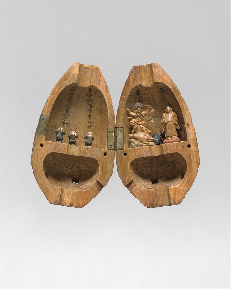 This arrowhead was probably made as a votive gift or souvenir in connection with a shrine dedicated to Tokugawa Ieyasu, the deified founder of the Tokugawa shogunate. Iside the arrowhead carved figures represent beings whose aid could be invoked for personal protection and success in battle. In the left half are the three sacred monkeys (Sambiki zaru), with the text of a prayer written behind them. In the right half are the Buddhist goddess Marishiten, who was especially venerated by archers, and Tokugawa Ieyasu. Behind them are the seed syllables representing two more deities: Aizen Myō-ō and Amida Nyorai>
