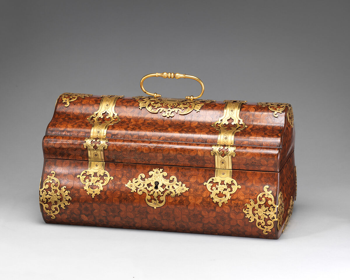 Displaying star-shaped parquetry and gilt-bronze mounts, this elegant coffer harks back to eighteenth-century traditions. The firm established by Alphonse Giroux (1775/76–1848)—a tabletier, or dealer in luxury goods—was known for its high-quality objects such as glove boxes, caskets for weddings and baptisms, gifts for the New Year, and small pieces of furniture in a variety of styles. In the tradition of eighteenth-century marchands merciers, Giroux and his sons probably did not make any of the offered wares themselves but commissioned them from a variety of artists.