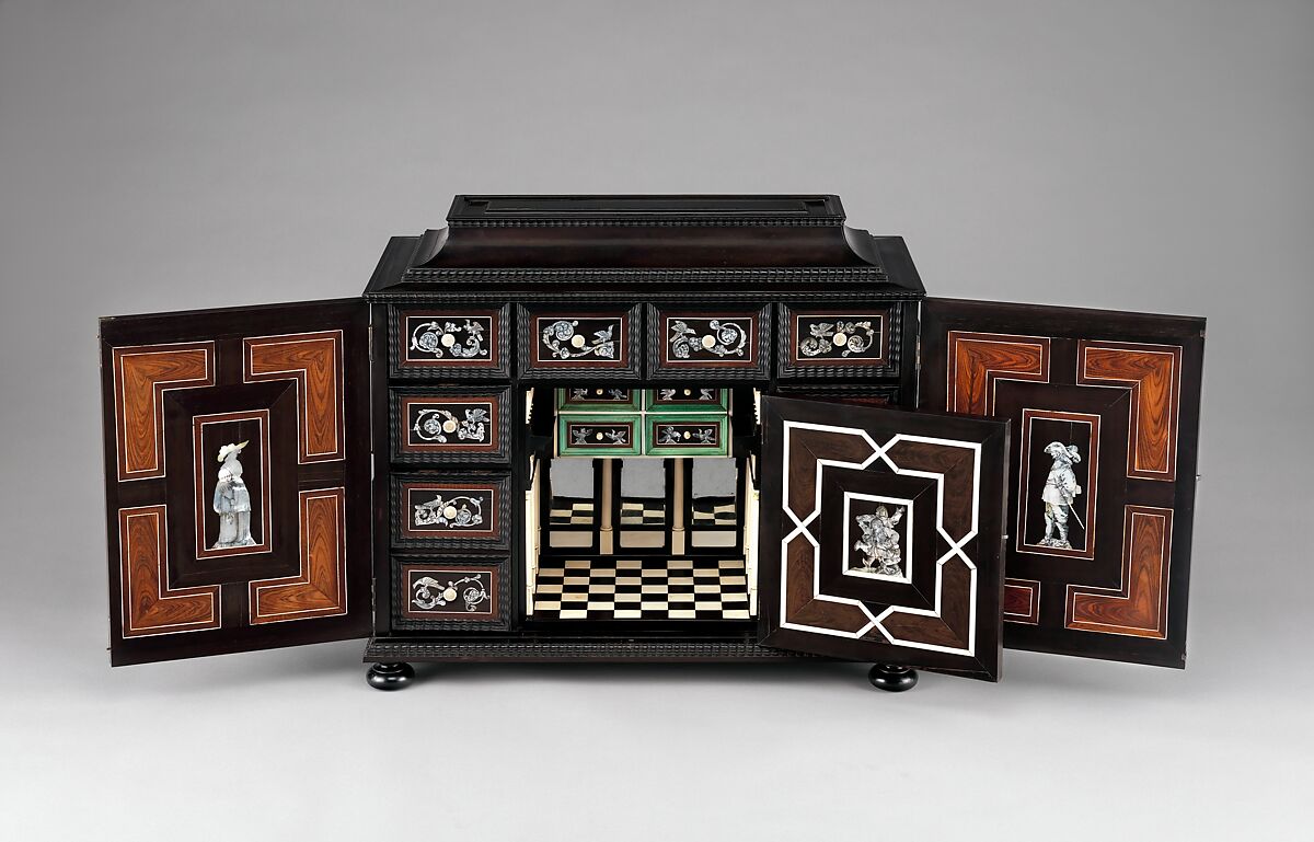 The sophisticated ripple moldings on the cabinet’s exterior playfully bring out the lustrous quality of the severe black ebony. Other tropical veneers as well as inlays of mother-of-pearl and green-stained horn enliven the cabinet’s interior which encloses multiple drawers as well as a compartment with a mirror-lined "stage" for the display of a treasured artwork. This cabinet is attributed to Herman Doomer, one of the few cabinetmakers working with ebony and mother-of-pearl in Amsterdam, the foremost European market for such exotic materials. Doomer gained fame through the portrait Rembrandt painted of him, also in the Museum's collection (see 29.100.1).