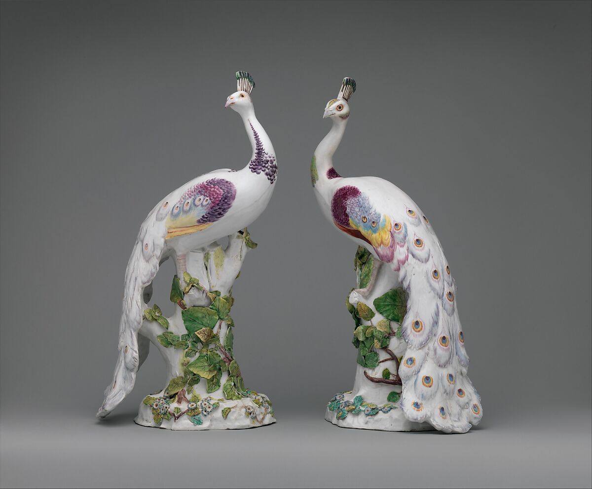 The modeler at Chelsea clearly conceived the two peacocks as a pair, as indicated by their complementary poses. Ornithological accuracy does not seem to have been a concern, based on the fact that if the modeler wished to depict a male and a female peacock correctly, the latter would have been notably smaller than the male. In addition, the coloration of both porcelain peacocks is very similar, whereas in nature, the female peacock, more accurately known as a “peahen,” would normally have much more muted feathers. The painted decoration of both birds gives prominence to the “eyes” of the tail feathers, which are the most distinctive aspect of the male peacock. The circles of pale blue, yellow, and purple enamel augmented by fine lines in red create an almost luminous effect that skillfully evokes the iridescence of a male peacock’s feathers. Each bird’s body is left mostly undecorated with the plumage only suggested by areas of purple, yellow, and pale blue. There are slight differences in the decoration of the two birds, and it appears they may have been decorated by two different painters at the factory.