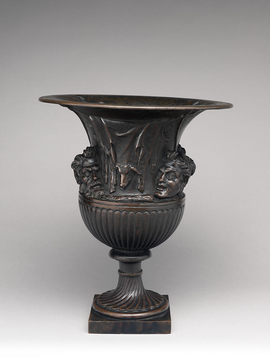 Giovanni Zoffoli was the brother or nephew of Giacomo Zoffoli, a Roman silversmith and bronze founder who built a successful practice, continued by Giovanni, of producing reductions after antique sculptures for those making the Grand Tour. It is difficult to separate the two, their work being quite consistent.[1] About 1785, Giovanni printed a list of available models, which on February 15 of that year the architect Charles Heathcote Tatham annotated and sent from Rome to fellow architect Henry Holland. Number 15 on the list, the “Vaso a Pila,” or basinlike vase, offered for 15 zecchini, is the same model as ours.[2] The model was in fact the smaller of two antique vases in the collection of the Borghese family, then in Rome but now in the Louvre, having been bought by Napoleon from his brother-in-law Camillo Borghese in 1807.[3]