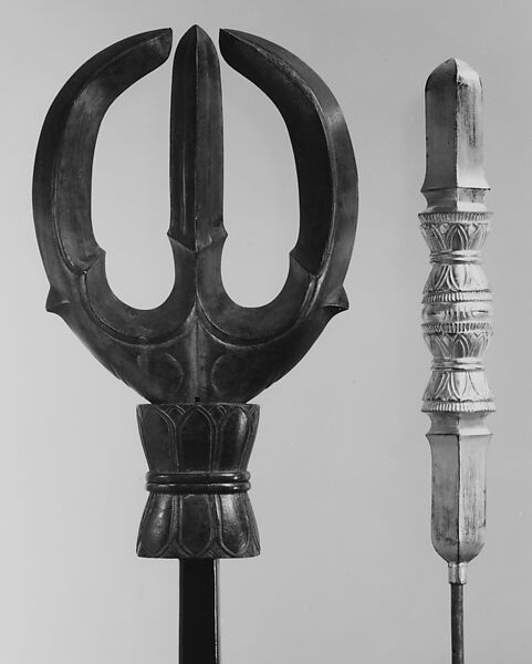 Similar in function to the crest is the sashimono, an insignia mounted on a vertical pole, which is held by a bracket attached to the backplate of an armor to make the symbol visible above the wearer's head. Sashimono usually take the form of a square or rectangular banner decorated with the heraldic device (mon) of a particular family or clan. Three-dimensional sashimono with deeper symbolic meaning such as this example are more rarely found. This sashimono and another in the Metropolitan Museum's collection (36.25.2834a, b) depict variations on the vajra (thunderbolt or diamond), one of the oldest and most powerful symbols in the Hindu and Buddhist religions. In a Buddhist context the vajra, through its association with the indestructibility of diamond, symbolizes the unshakable and eternal nature of Buddhist beliefs. The diamond's clarity and brilliance embody knowledge and truth, while its purity represents the concept of perfect emptiness, which is seen in Buddhism as a fundamental aspect of enlightenment.