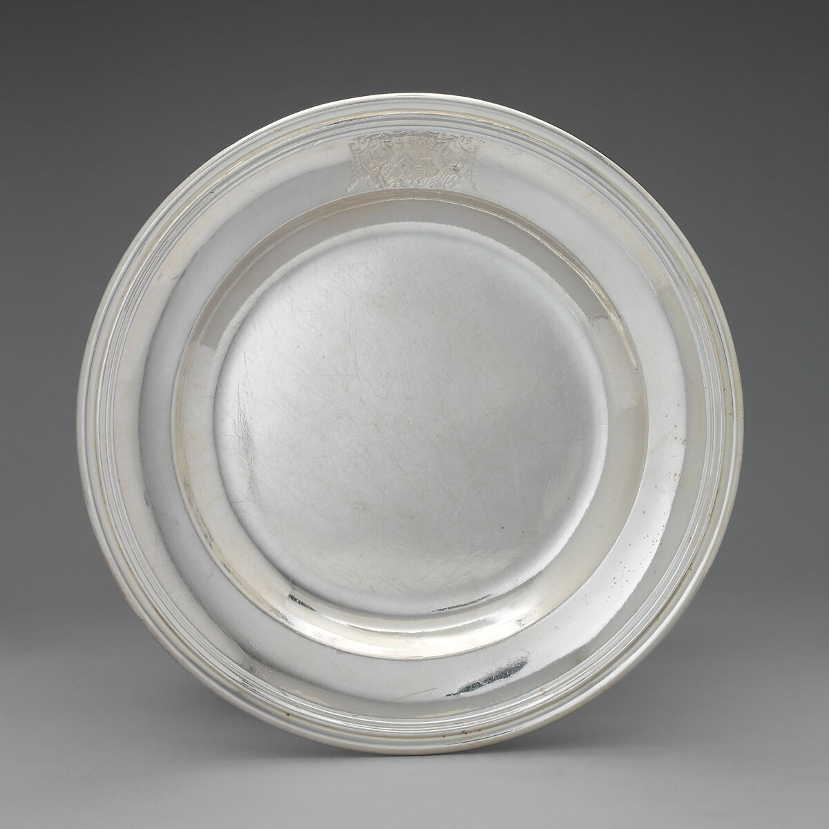 Silver dinner plates like these were often supplied in sets of 36, so that 3 courses could be served to a table of 12. The simplicity of this set (consisting of 12 plates) is typical of most British eighteenth-century examples. Their only ornamentation is the heraldry engraved on the rim (where it was less likely to be damaged from the use of forks and knives), which combines two separate coats of arms. This suggests that these plates were commissioned in celebration of a marriage. Each plate has also been stamped with the maker’s mark of Thomas Farren, later the Subordinate Goldsmith to the King.