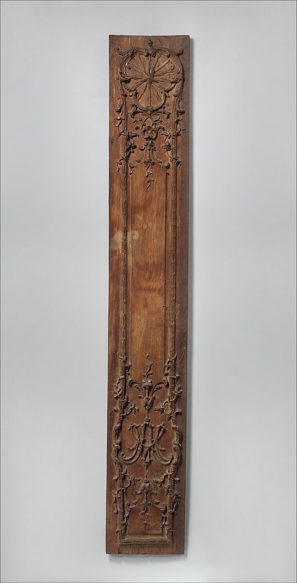 This pair of panels display symmetrical carving of scrolling acanthus leaves, C and inverted C scrolls as well as vines winding around an upright molding of tied fasces. A radiating star is carved near the top of each panel and the interlaced letters A and M, for Ave Maria (Hail Mary), on the lower half which strongly suggests an ecclesiastical context. Once painted and part of a larger decorative ensemble, these pieces were among the model collection of woodwork, paneling and seat furniture of Maison Leys, a successful decorating business, located at the Place de la Madeleine in Paris. Since 1885 the business was directed by Georges Hoentschel who installed the collection in 1903 in a museum-like display at Boulevard Flandrin, Paris. Three years later, Hoentschel sold the collection to J. Pierpont Morgan who gave the panels with the rest of the decorator’s seventeenth and eighteenth century objects to the Metropolitan Museum of Art in 1907.
