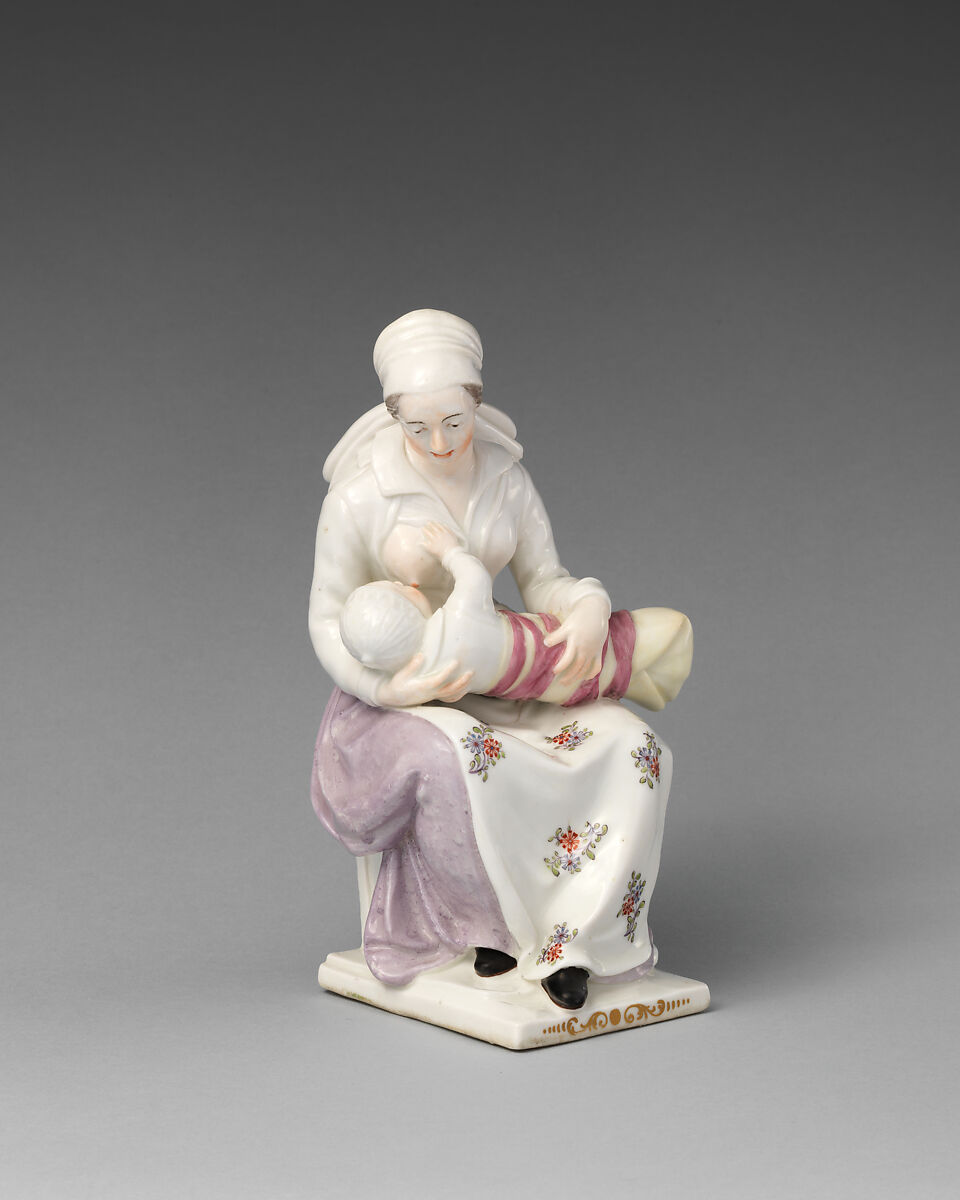 It is not clear why the figure of a wet nurse with a suckling child, based upon an early seventeenth- century French pottery model, exerted appeal in England in the mid-eighteenth century, but its popularity was such that the model was copied at the Liverpool factory of Richard Chaffers (British, d. 1765) around 1760,[9] and it was also produced in Staffordshire in creamware (lead-glazed earthenware).[10]