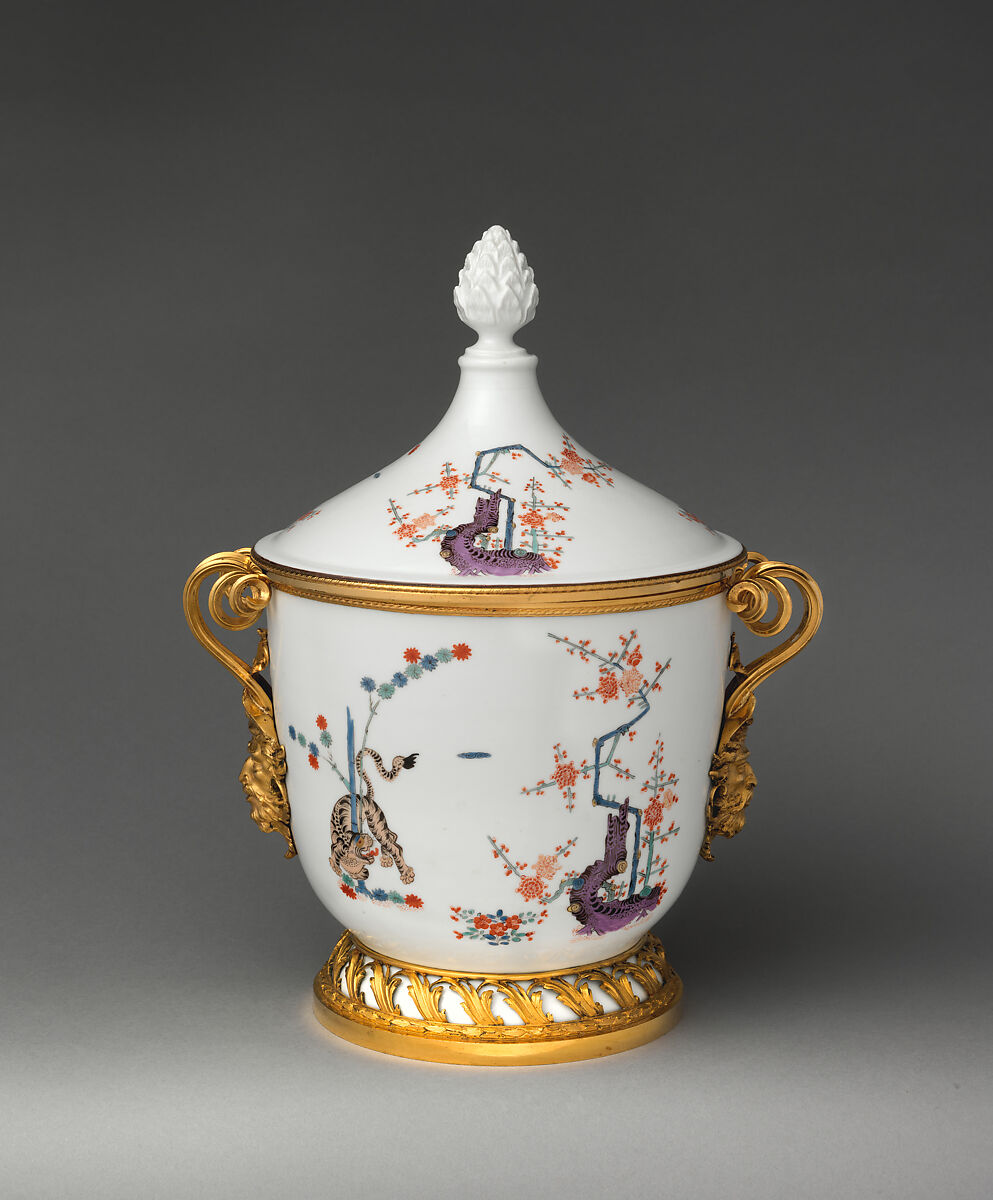 Originally made to contain ice cream, these tall covered jars were produced at the Meissen factory in about 1730. Incised inventory marks indicate that they were originally part of the Saxon royal collections housed in the Japanese Palace in Dresden, where the enormous holdings of both Asian and Meissen porcelain owned by Augustus the Strong were displayed. Archival documents suggest that these jars were removed from the Japanese Palace and combined with similarly decorated Meissen porcelain to form a dinner service that was presented as a gift to Sir Thomas Robinson (1695–1770), a British diplomat who visited Dresden in 1737.