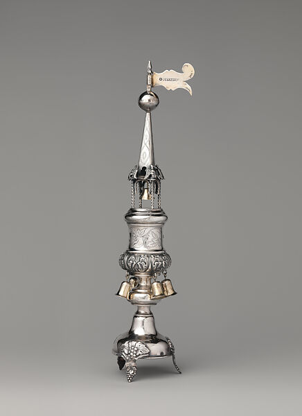 The spice tower (or besamim) in used during the Havdalah, a Jewish ritual that marks the end of the holy Sabbath, in which a special candle and spice essence are used for blessing, and the spice smelling is perceived as enhancing the Jewish spirit after the pleasantry of the Shabbat before returning to daily routine. Such spice containers exist in a variety of shapes and designs. The present tower form is the first example to enter to Met’s collection.