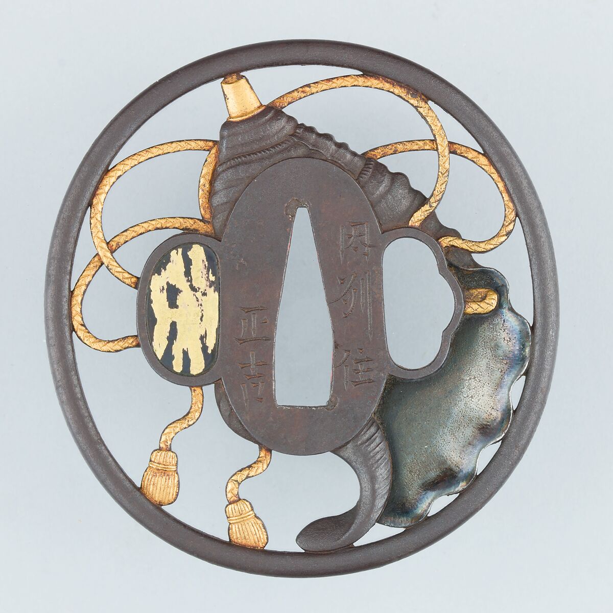 The decoration on this example features a conch shell entwined with tasseled cords, executed in pierced and chiseled iron with silvered and gilt highlights. The conch shell is one of the Eight Glorious Buddhist Emblems, or the Eight Auspicious Symbols, which represent the venration of the Buddha. They appear both in the context of religious rituals and as decoration for objects of everyday use. The conch shell signifies victory and represents the dissemination and the strength of Buddhist doctrine. These meaning evolved in part as a result of the military use of the conch as a signaling trumpet. In this capacity, and as a ritual object, the conch is closely identified with the yamabushi.