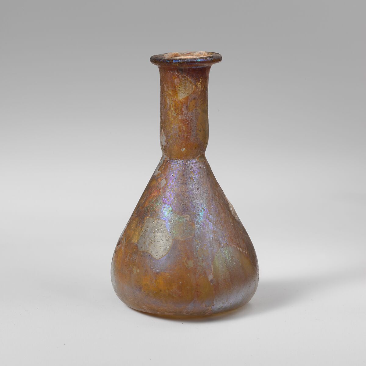 Rim folded out, over, and in, flattened unevenly into mouth at an angle; cylindrical neck, tooled in at base; sides of body sloping out and downward; bottom slightly concave at center.