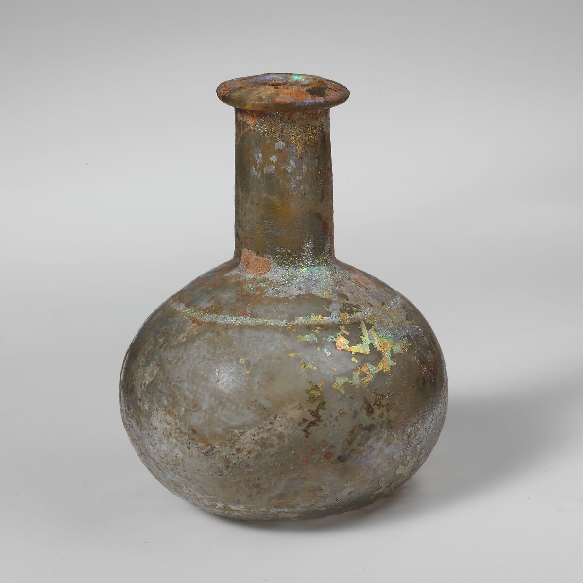 Rim folded out, over, and in, with beveled upper surface; cylindrical neck, with slight tooling marks around base; squat, globular body; slightly concave bottom. Fairly heavy, thick glass.